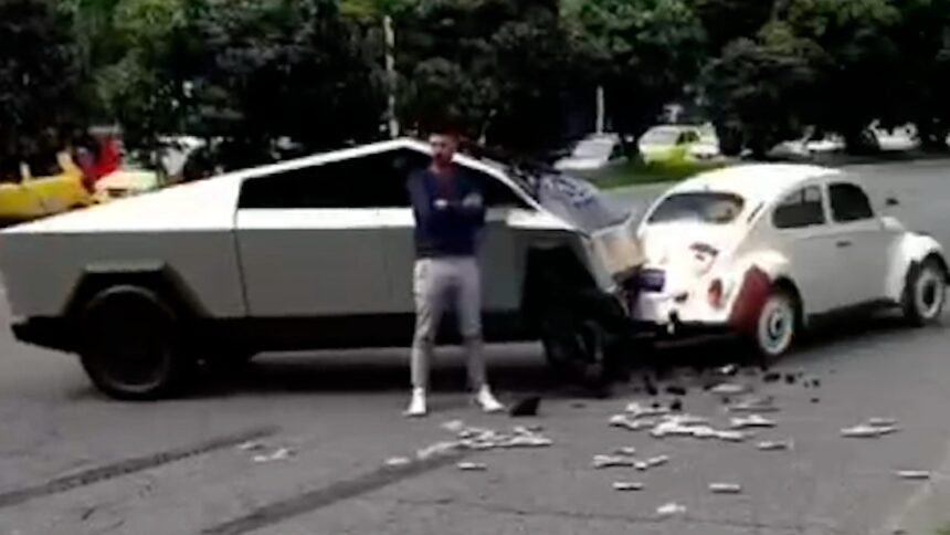 Dicen por ahí que "no hay rival pequeño" y, unos automovilistas lo comprobaron con sus vehículos, luego de que una camioneta Cybertruck de la marca Tesla chocara con un vochito…